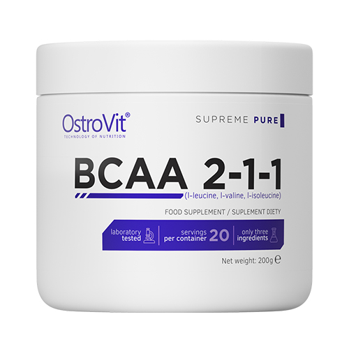 BCAA 2-1-1 от OstroVit – это пищевая добавка, содержащая аминокислоты с разветвленной цепью высочайшего качества (BCAA) в наиболее предпочтительном соотношении 2:1:1;